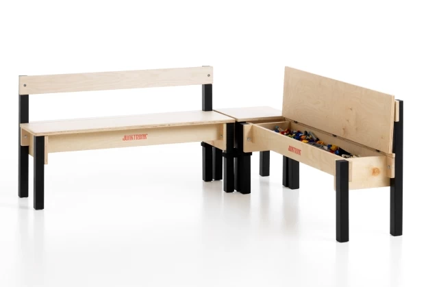 Twee 3-zits opbergbanken Large met rugleuning en een (hoek-)krukje vormen samen een hoekbank. De verschillende delen worden met behulp van rubberen connectoren aan elkaar gekoppeld tot een hoekbank. Hoekbank (2x 3-zits opbergbank Large met rug en hoekkrukje) L 147 cm x B 35 cm x H 60 cm, zithoogte 40 cm. De hoekbank is uitgevoerd in berkenmultiplex en afgewerkt met een kind- en milieuvriendelijke transparante matte lak. De beukenhouten poten zijn afgewerkt met een mat zwarte lak.