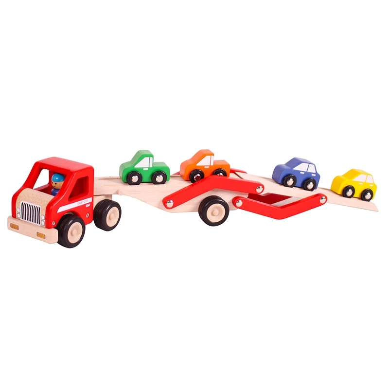 Een mooi afgewerkte houten autotransporter met 4 auto’s in 4 kleuren. Het bovenste autodek kan naar achteren scharnieren en sluit dan als oprit aan op het onderste autodek zodat de autootjes er op en er af kunnen rijden. De wielen hebben rubber bandjes die zorgen voor comfortabel rijden en goede grip op de vloer.