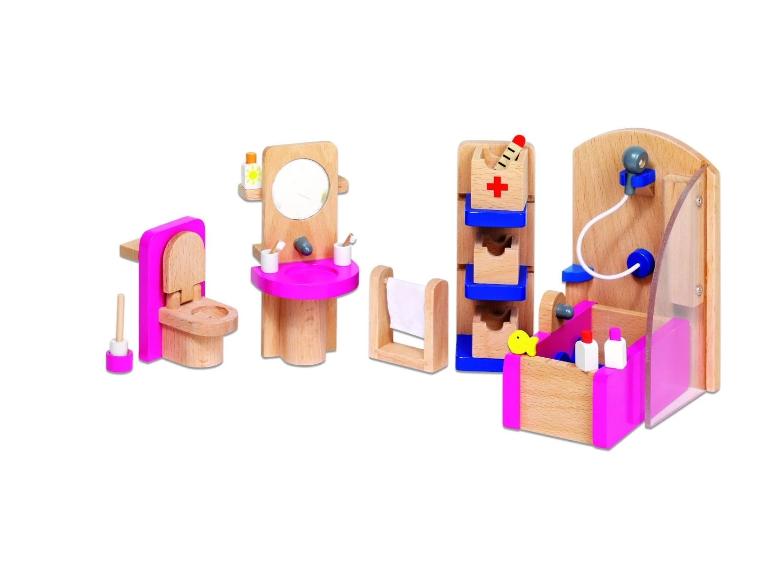 22-delige badkamerset t.b.v. poppenhuis. De set bestaat o.a. uit een bad/douche cabine, wastafel, toliet, handdoekrekje, kastje enz.