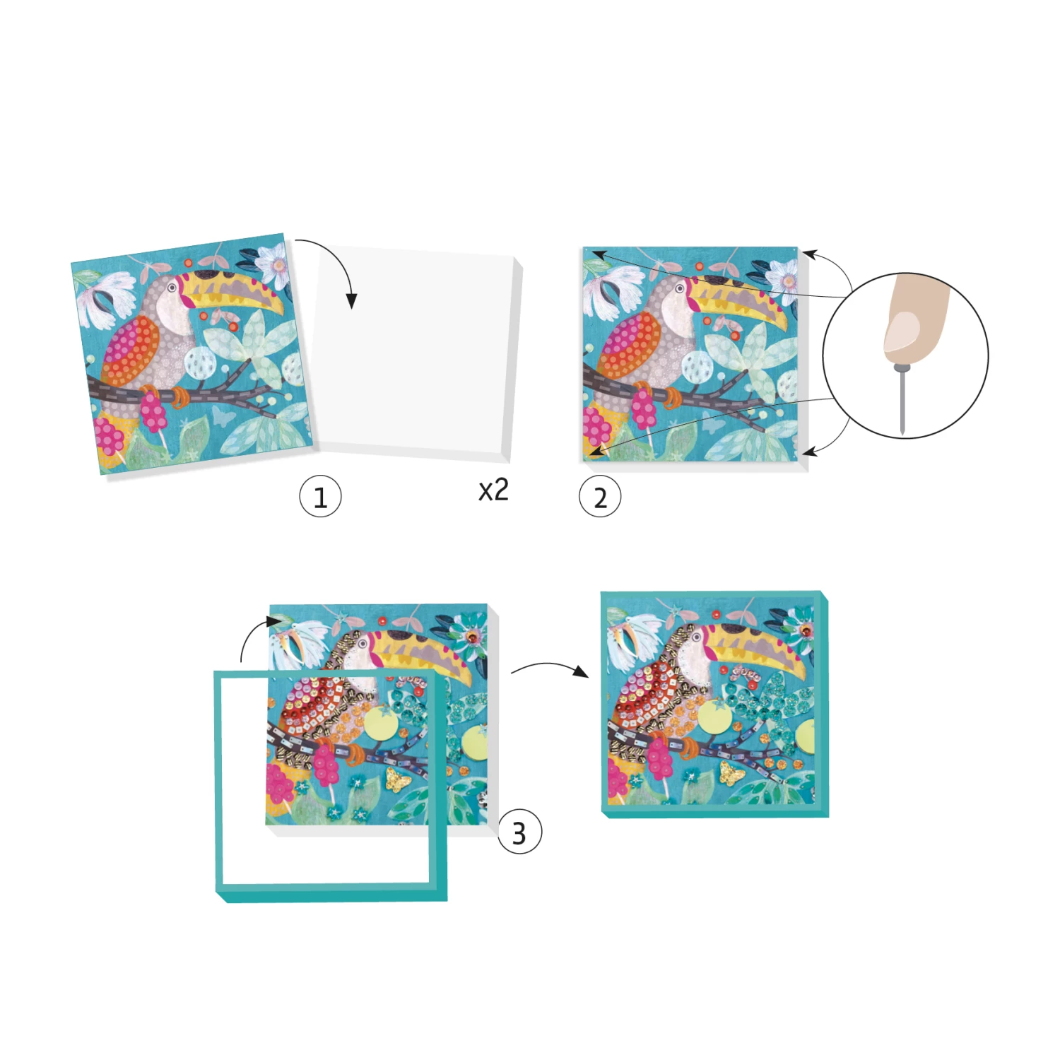 Exotisch knutselpakketΒ van Djeco. Maak 2 schitterende schilderijtjes door de lovertjes metΒ de kleine naaldjes op de gekleurde ondergrond vast te prikken.Β Volg hierbij de stappen in de bijgeleverde handleiding.