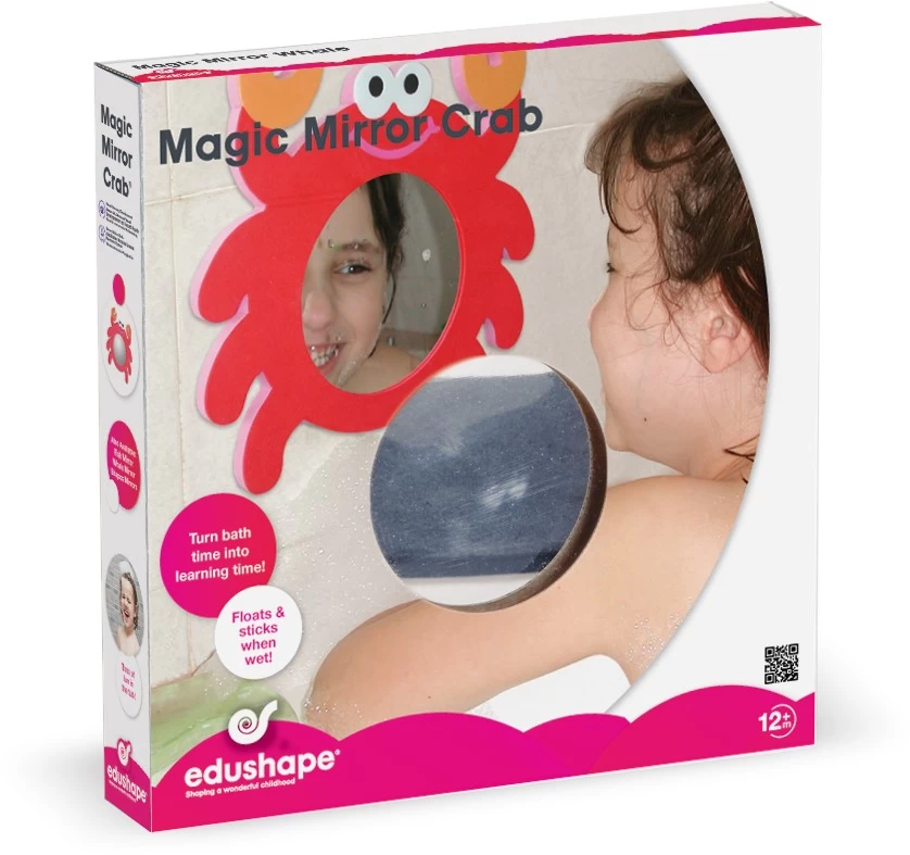 Een spiegel in de vorm van een vriendelijke krab. Neem de krab mee in bad en laat hem zwemmen of plak hem op de badkamertegels.