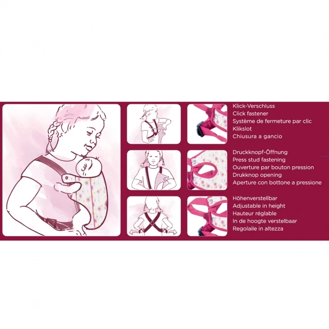 Als je gaat wandelen, kruipt je babypop tegen je aan en heb je je handen vrij. Een praktische drager in zachte kleuren. Je hebt maar een paar klikken nodig tot de drager goed past en je pop een veilige zitplaats heeft.