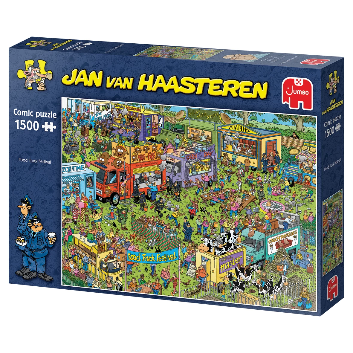 Jan van Haasteren Food Truck Festival 1500 stukjes. Soort: Legpuzzel. Aantal puzzles: 1500 stuk(s). Genre: Strips, Doelpubliek: Kinderen & volwassenen, Aanbevolen geslacht: Jongen/meisje, Aanbevolen leeftijd (min): 12 jaar. Breedte: 900 mm, Hoogte: 600 mm