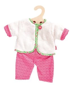 Kledingsetje bestaande uit een jasje en een broek. Het jasje kan aan 2 zijden gedragen worden. M.n. de witte stof van het jasje voelt heel zacht en knuffelig aan. compleet met kleerhangertje.