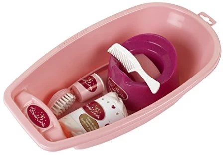 Poppenbadje met toebehoren; potje, luier, badborstel, spons, kam en cremepotje.