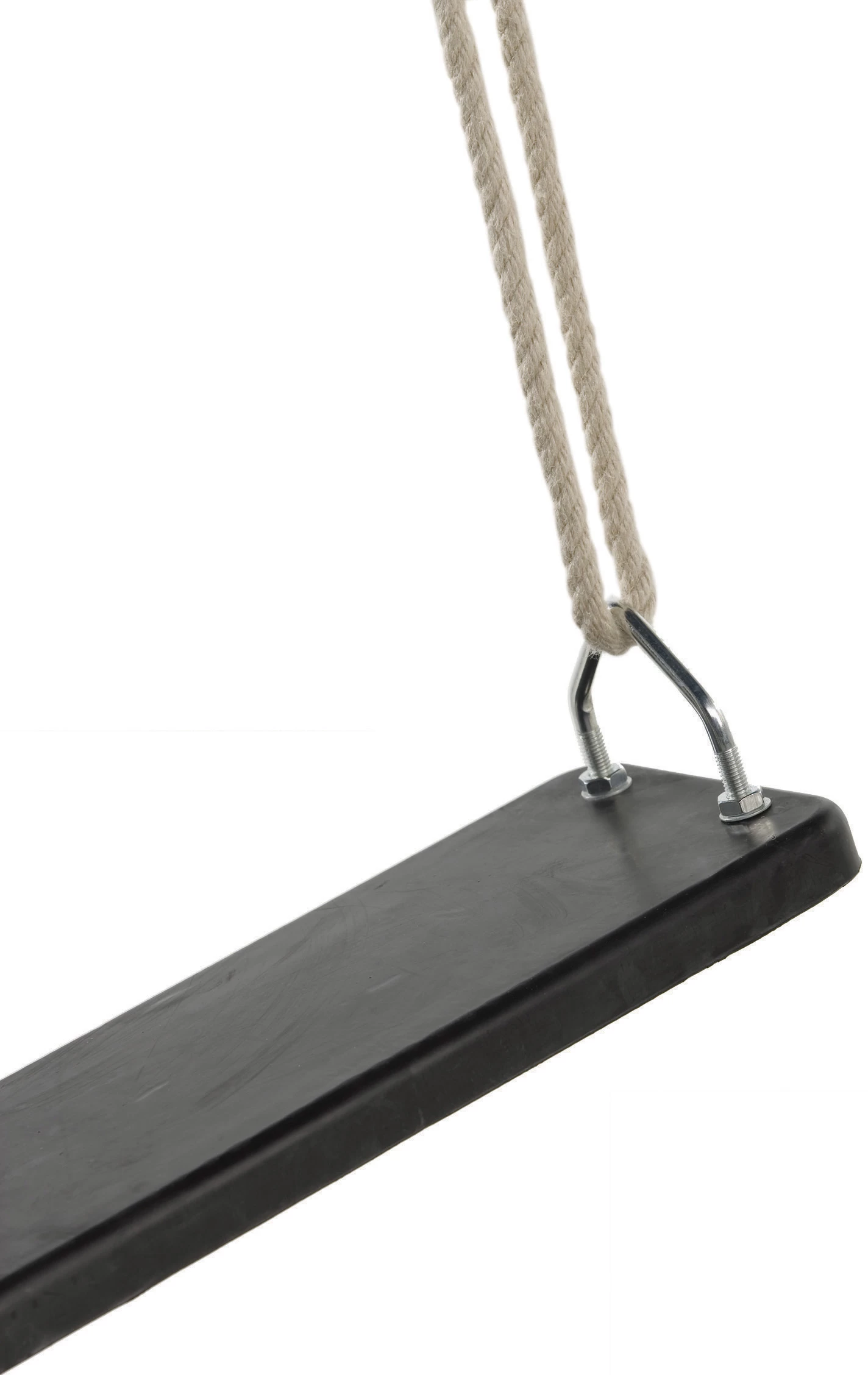 Rubber schommelzitje, stalen binnenplaat, met 12 mm. PH-touwenset. Beugels, stelachten en ophangogen uit gegalvaniseerd staal. Zwarte kunststof lassen als touwverbinding.
