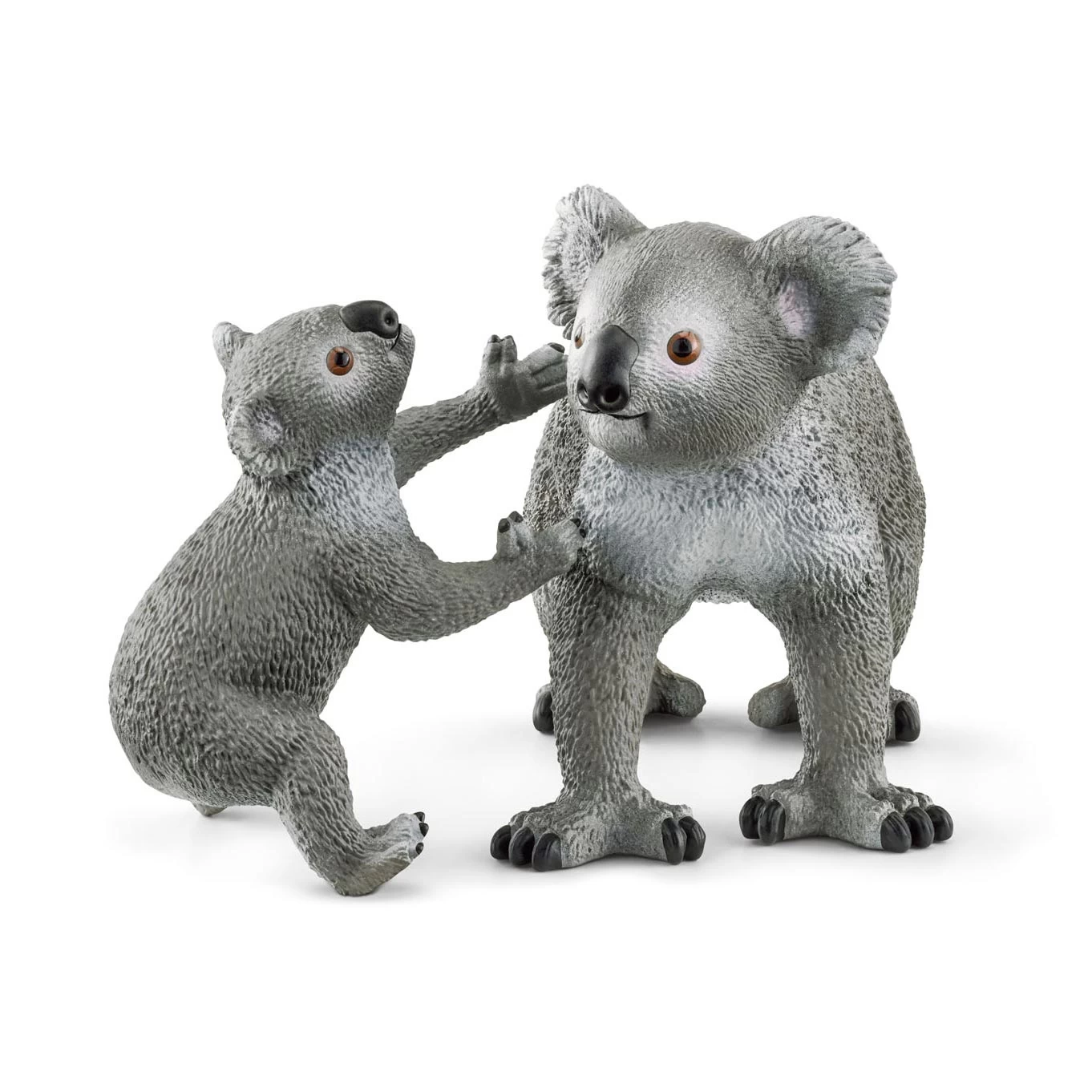 De koalamoeder en haar baby van schleich® WILD LIFE eten graag samen een lekker eucalyptusontbijtje. Eu-ca-lyp-tus. Zeg dat maar eens 10 keer achter elkaar zonder over je woorden te struikelen! Na het ontbijt houdt de kleine joey zich stevig vast aan zijn moeder als ze weer de boom in klimt.
