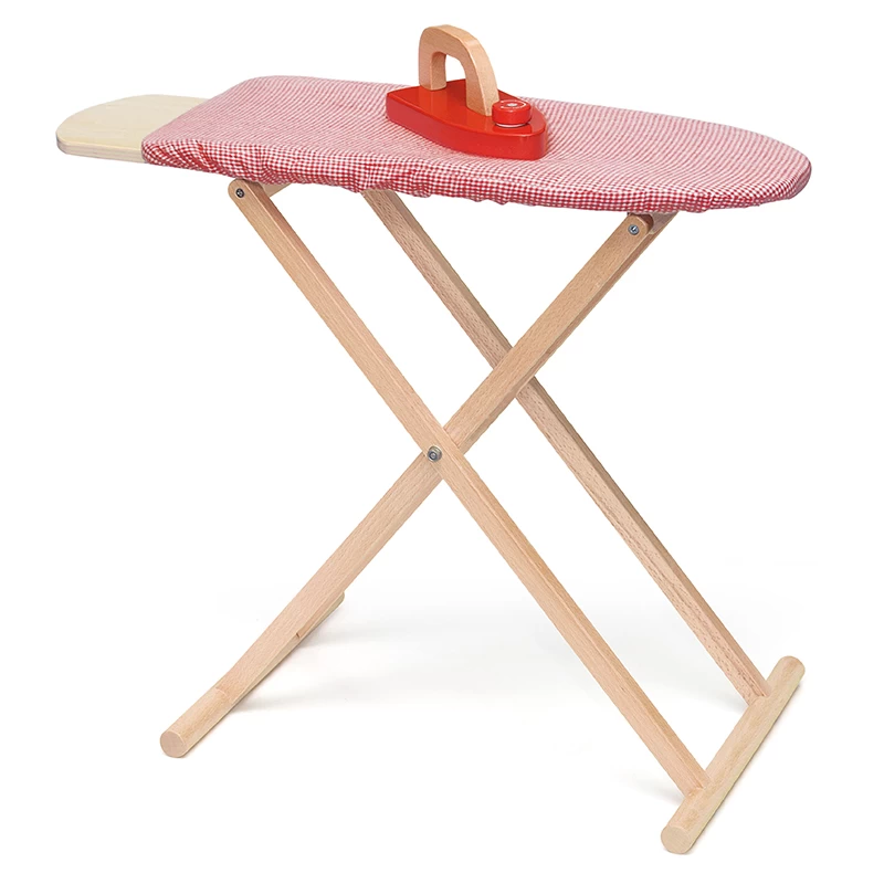 Een degelijke strijkplank, gemaakt van beukenhout i.c.m. berken multiplex. De knop van de strijkbout kan draaien om de temperatuur in te stellen.
