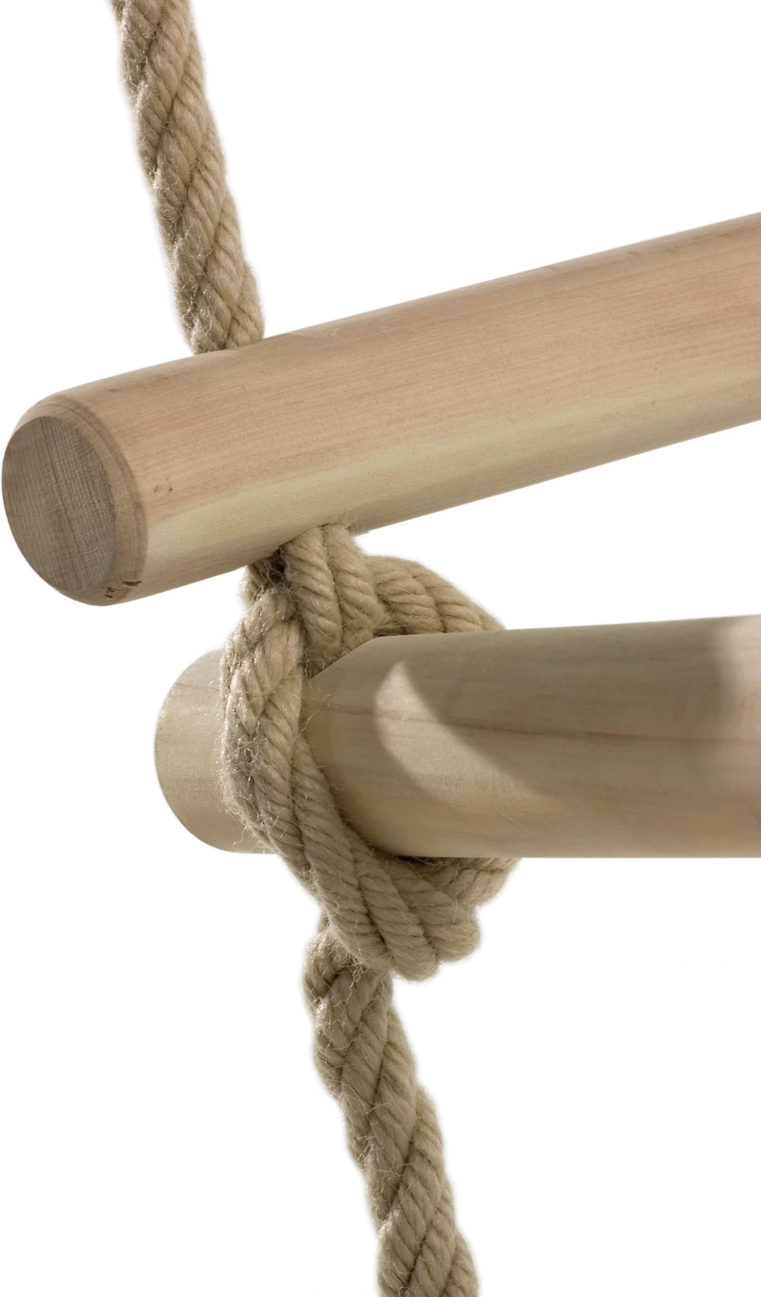 Polypropyleen touwen diameter 10 mm door-en-rondom de sporten geknoopt. Afstand tussen de sporten 350 mm. De lengte van het bovenste touweind varieert. Totale lengte circa 210 cm.