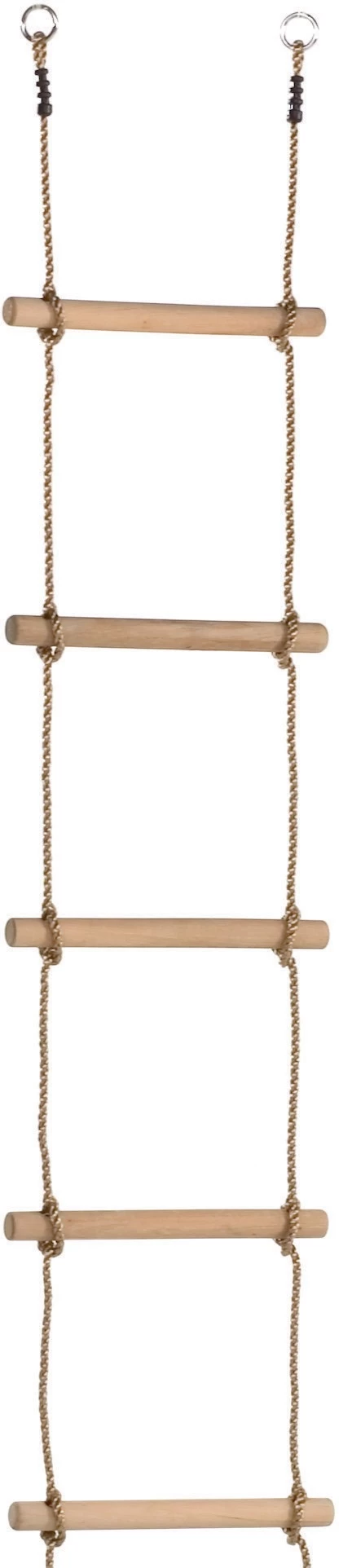 Touwladder met 5 geimpregnerd beukenhouten sporten. Diameter sport 35 mm; lengte sport 400 mm. Polypropyleen touwen diameter 10 mm door-en-rondom de sporten geknoopt. Afstand tussen de sporten 350 mm; de totale lengte is 1,95 m.