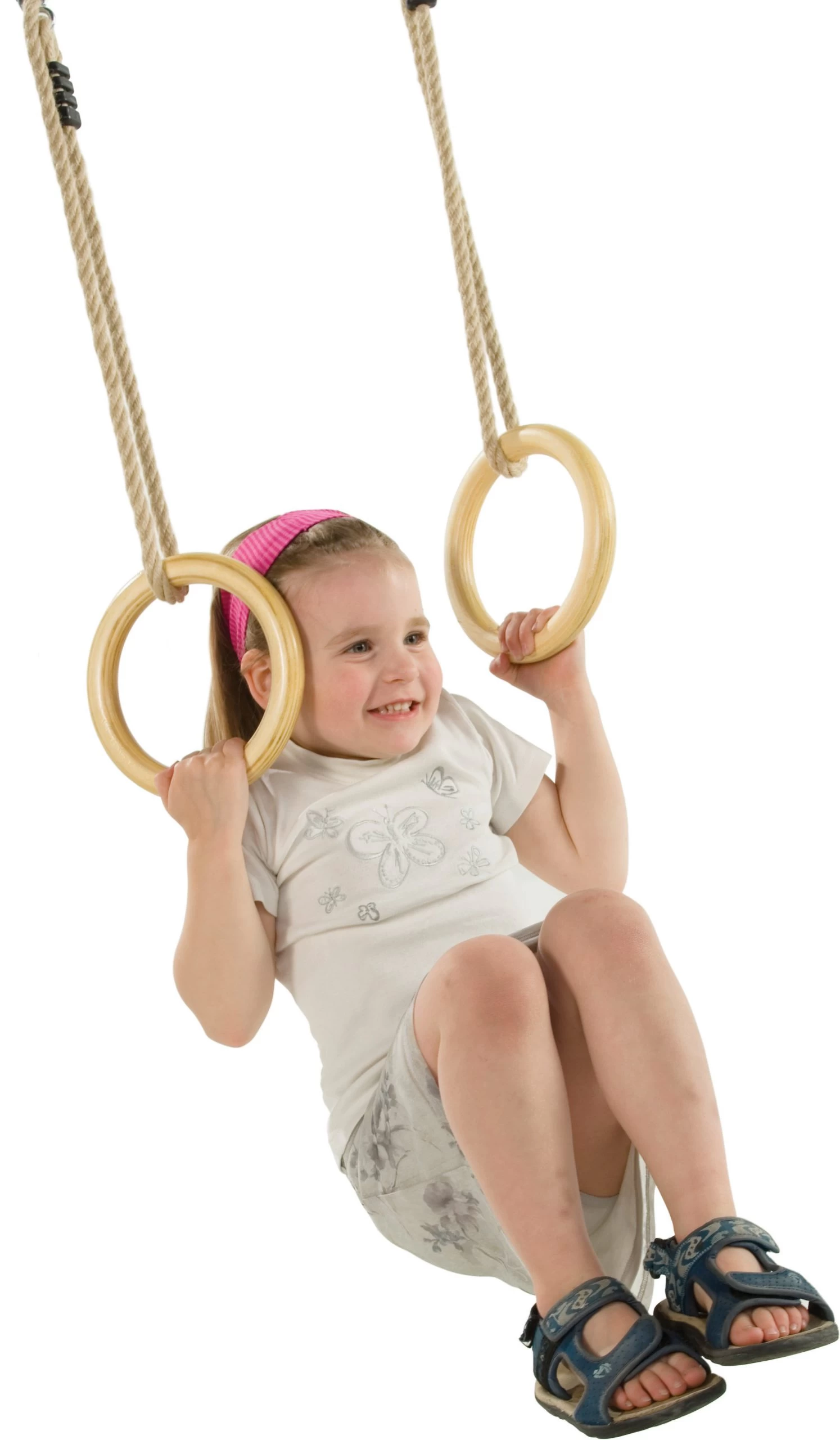 Deze turnringen liggen heel fijn in de hand. Net als in de sportzaal. Compleet met 12 mm. PolyHemp-touwenset. Deze ringenset mag niet buiten blijven hangen! De ringen zijn gemaakt uit vernist multiplex, de ophangringen en stelachten zijn uit gegalvaniseerd staal.