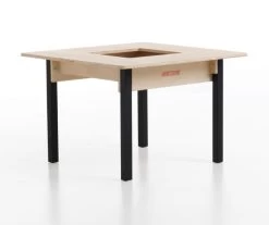 Vierkante speeltafel met vast bovenblad voorzien van een ruim opbergvak in het midden van het blad. Speeltafel vierkant L 95 cm x B 95 cm x H 60 cm. De tafel is uitgevoerd in berkenmultiplex en afgewerkt met een kind- en milieuvriendelijke transparante matte lak. De beukenhouten poten zijn afgewerkt met een mat zwarte lak.