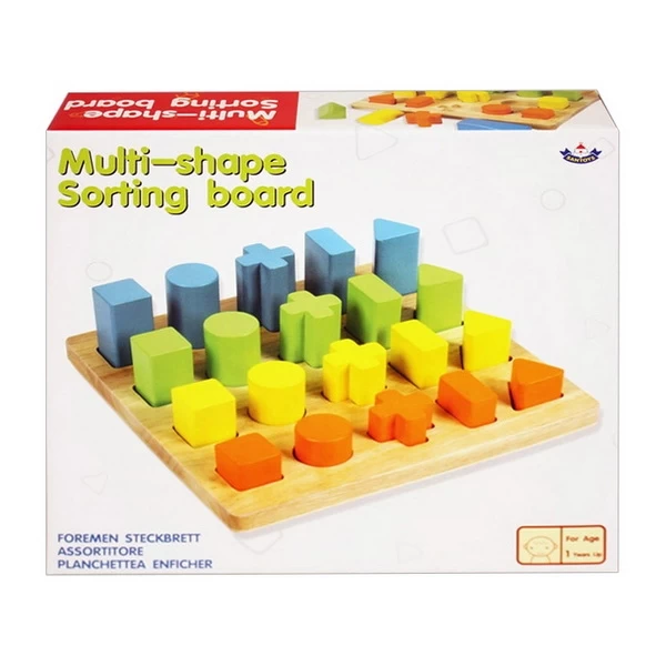 Een mooi vormensorteerbord met 20 geometrisch gevormde blokken, verdeeld over 4 kleuren en 5 geometrische basisvormen. Bedoeld om de meest bekende geometrische vormen te leren herkennen en de blokken naar kleur en lengte te leren rangschikken.